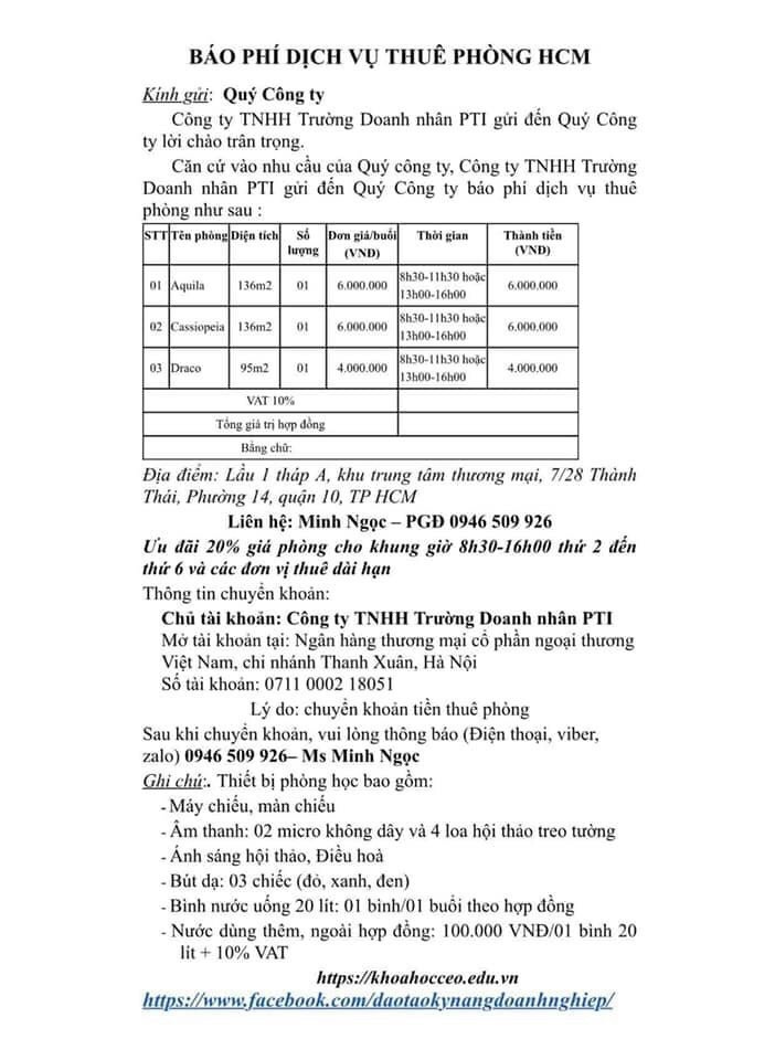 Chủ tài khoản: Công ty TNHH Trường Doanh nhân PTI